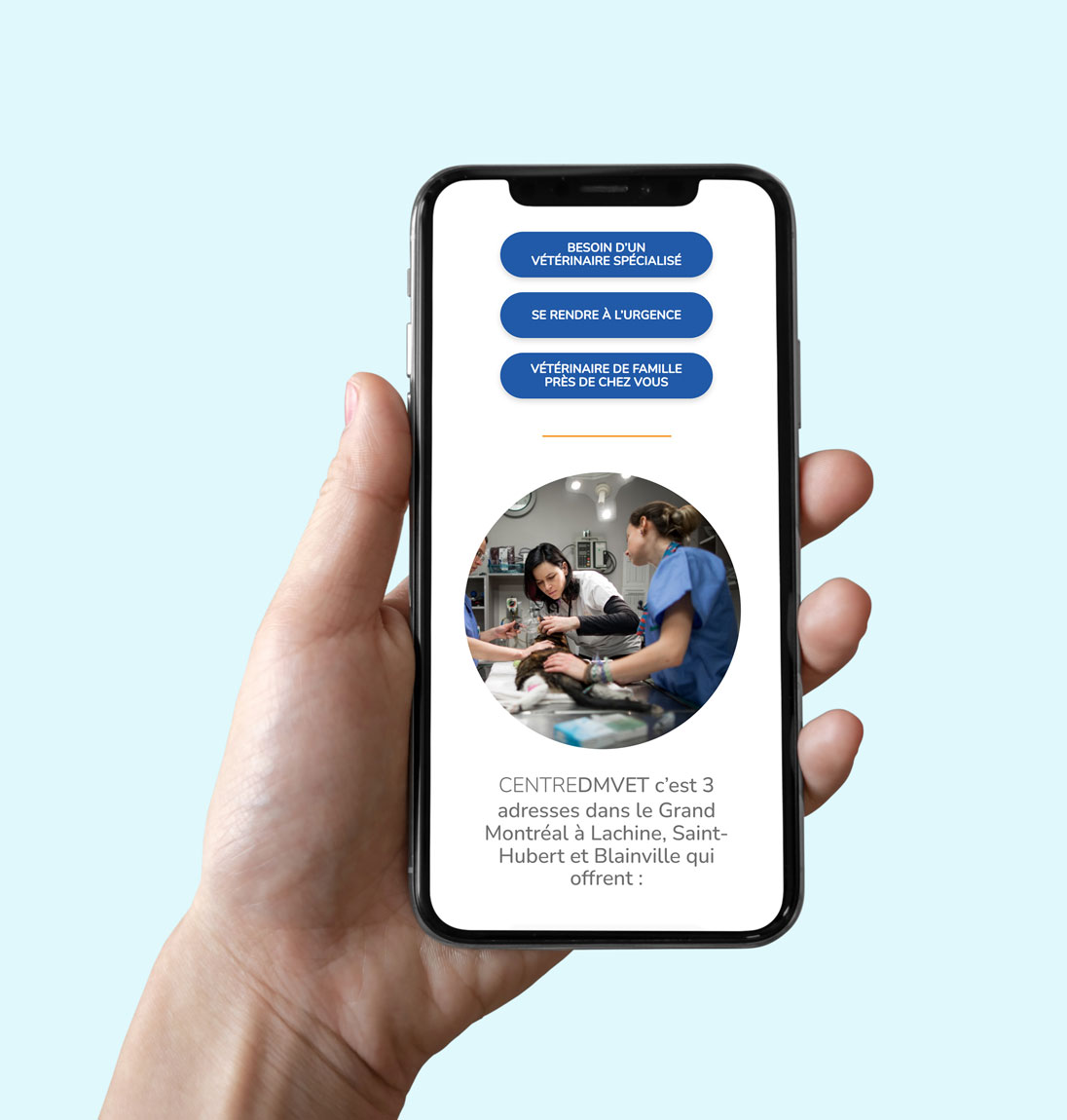 Centre vétérinaire basé au Québec, CentreDMVET propose des soins spécialisés et d’urgence assurés par une équipe multidisciplinaire. Suite à la création de leur nouveau logo, l’équipe souhaitait faire évoluer sa page d’accueil afin qu’elle reflète cette nouvelle direction artistique, sans engager une refonte complète du site.