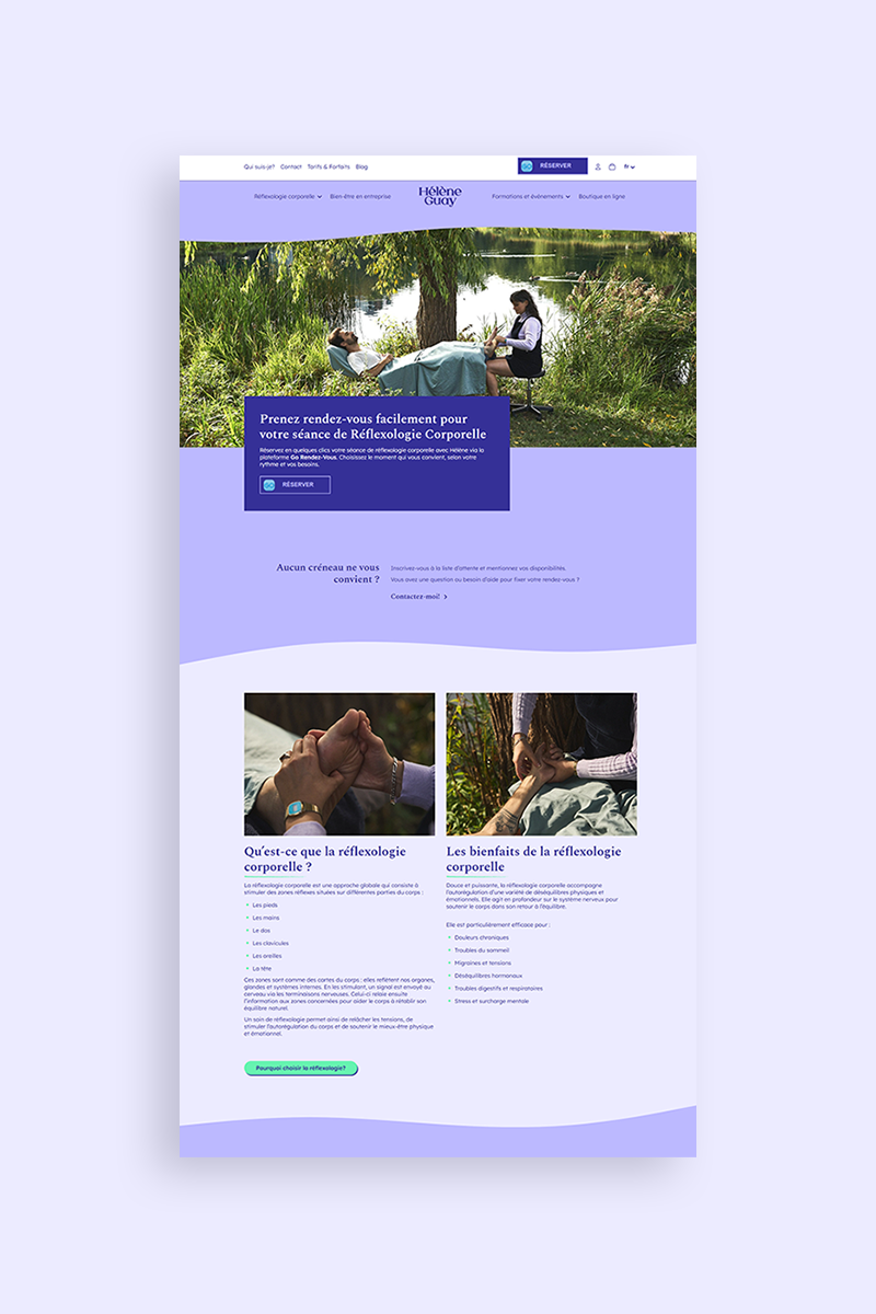 Organisation du contenu pour mettre en avant à la fois l’activité de réflexologue et l’univers artistique d’Hélène, tout en conservant une navigation claire et cohérente.