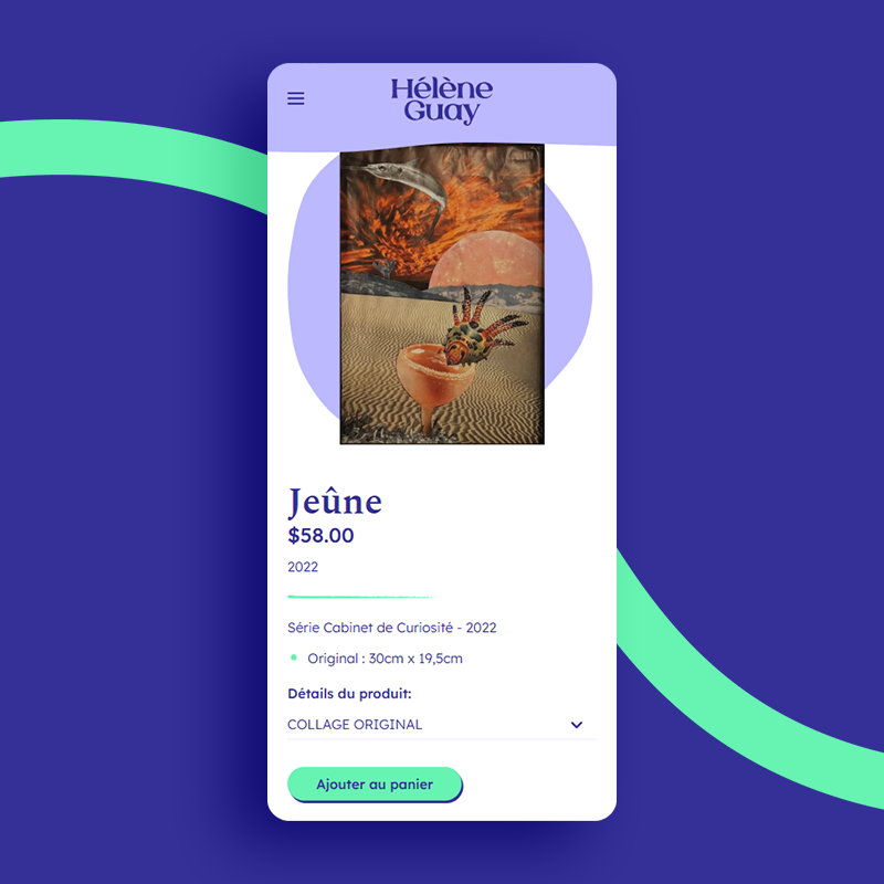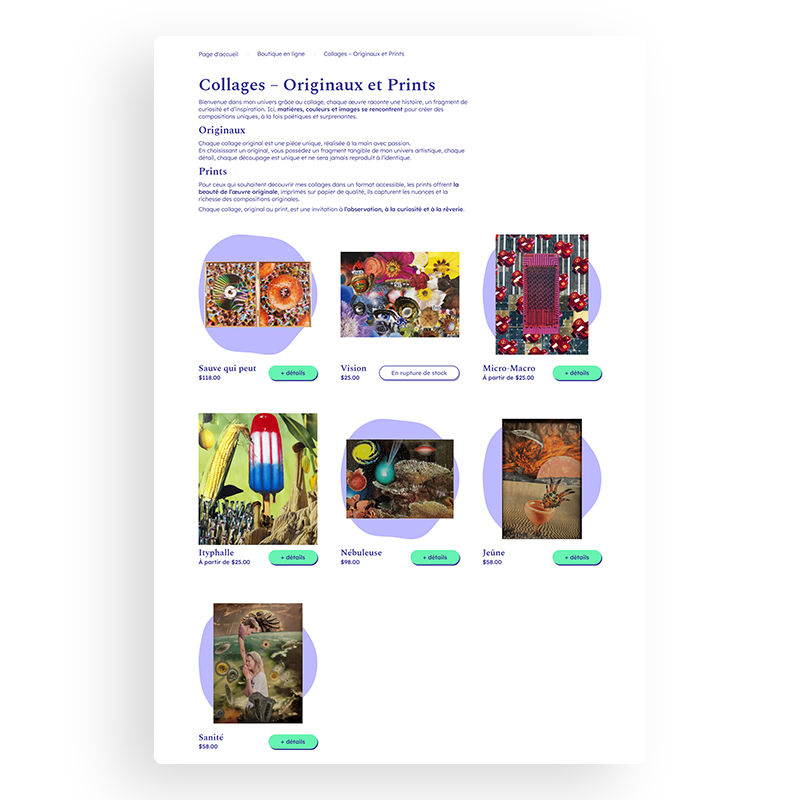 Intégration d’une boutique en ligne pour exposer et vendre ses collages simplement, avec un parcours d’achat fluide et adapté à ses besoins, sans complexité inutile.