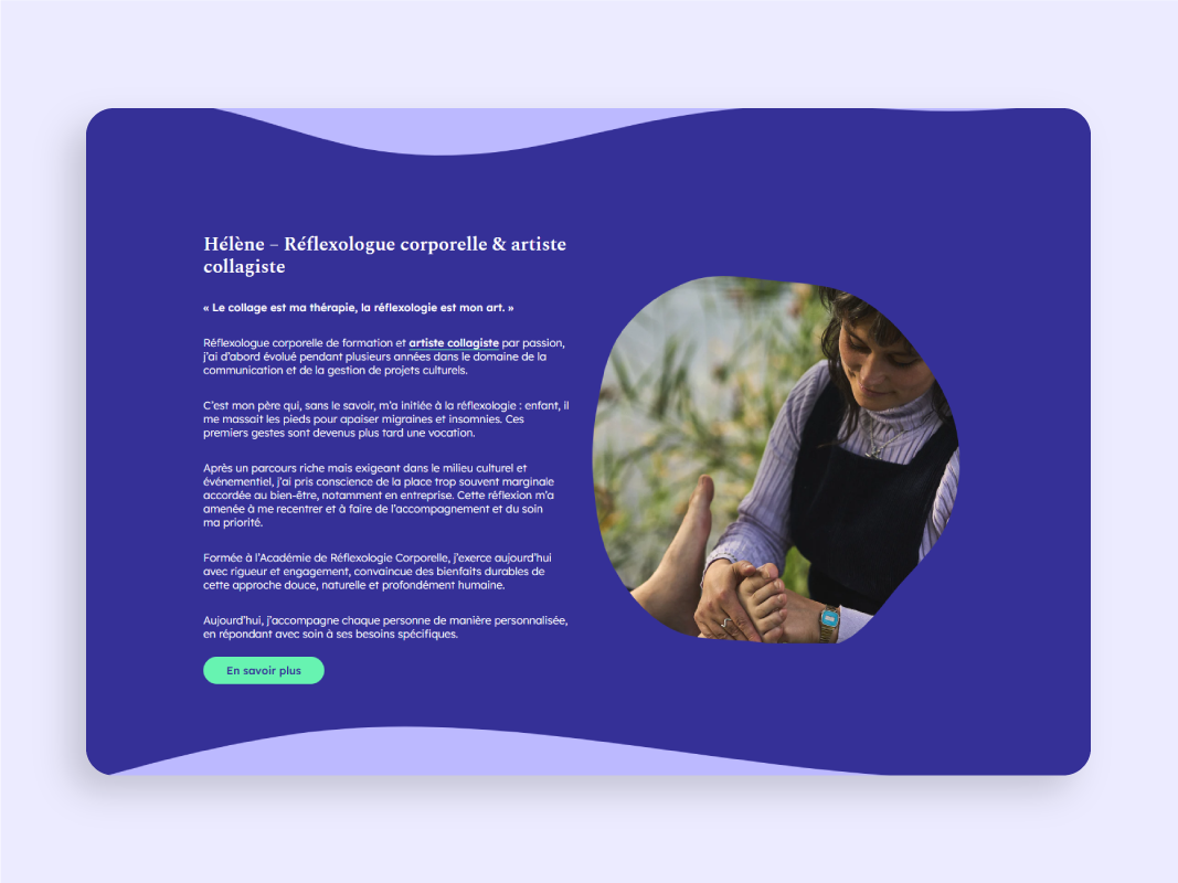 L’univers visuel du site a été pensé comme un prolongement de celui d’Hélène. Réflexologue et artiste collagiste, elle souhaitait un site en harmonie avec son monde personnel. Le travail graphique met en valeur cette sensibilité, tout en restant lisible, cohérent et au service de l’expérience utilisateur.